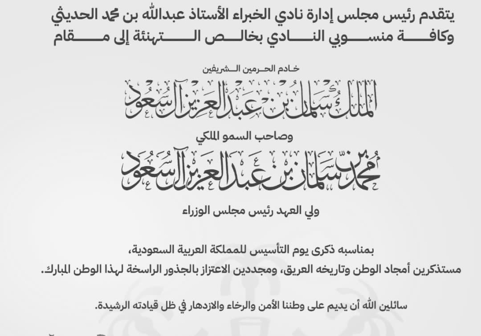 رفع رئيس مجلس إدارة نادي الخبراء الأستاذ عبدالله بن محمد الحديثي، نيابةً عن كافة منسوبي النادي، أسمى آيات التهاني وأصدق التبريكات إلى مقام خادم الحرمين الشريفين الملك سلمان بن عبدالعزيز آل سعود – حفظه الله – وإلى صاحب السمو الملكي الأمير محمد بن سلمان بن عبدالعزيز آل سعود – حفظه الله – ولي العهد رئيس مجلس الوزراء، وإلى الشعب السعودي الكريم، بمناسبة ذكرى يوم التأسيس الموافق 22 فبراير.